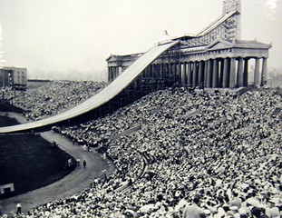 On March 4, 1938, a 151-foot ski jump tower had been built on the edge at the Los Angeles Coliseum where ski jumpers competed before 88,000 spectators on a 60-meter hill constructed in the stadium. Five hundred tons of crushed ice were utilized.