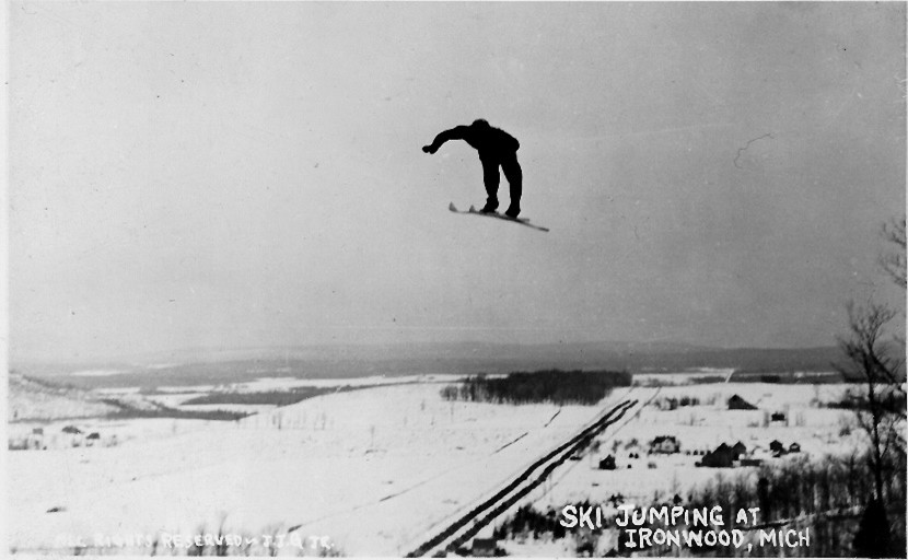 In 1938 the Kings Gateway Hotel in Land ‘O Lakes, WI, (60 miles East of Ironwood, MI) built a 100 ft. ski jump tower and Landing slope (30-meter hill) on the flat topography of the golf course. They invited the best ski jumpers to compete in exhibition and sponsored one of the first Nordic Combined meets in the Midwest.