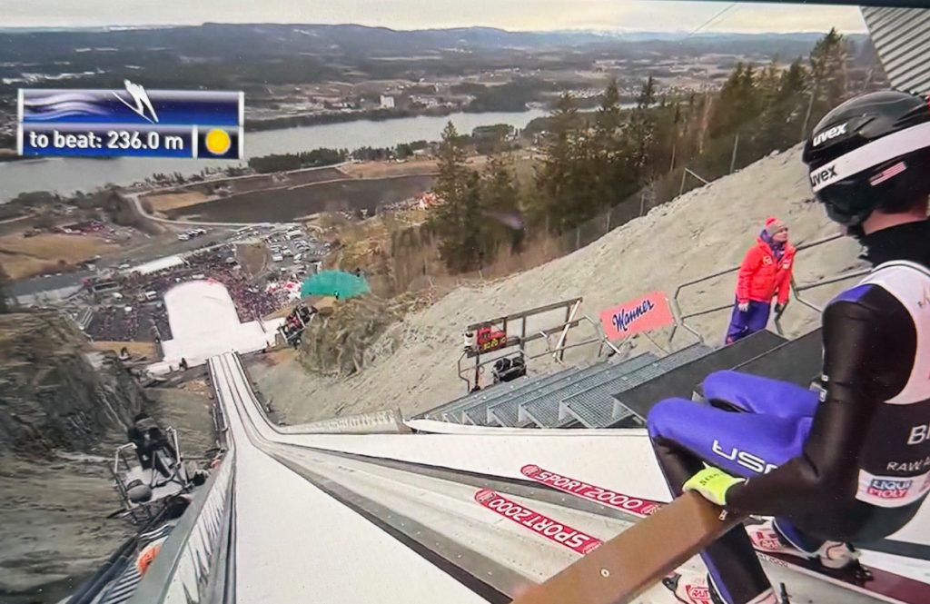 Fast forward 10 years, and I find myself sitting at the top of the ski flying hill in Vikersund, Norway. It was a windy Sunday, and Stefan Kraft had just set a new world record the day before. I had been hovering around 200 meters all weekend, but I was hungry for a new personal best. I was a little nervous watching athletes being taken off the bar much more frequently than in your average event. Finally, it was my turn to hop on the gate. I tried breathing deeply to calm my nerves, but it did little to help. As the clock ticked closer to the 45-second limit, I, too, thought I would be moving back to the starting gate. Then suddenly, with just a few seconds left, the light turned green. It caught me a bit off guard, but I saw the wind flags pointing up the hill, and I knew this was the golden opportunity for a far jump. Nerves turned to adrenaline, and I slid off the bar with two things on my mind: push off the takeoff as hard as you can and pull your body forward until you feel lift.