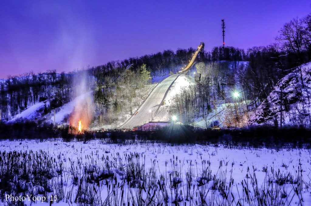 When you stand at the base of Suicide Hill on a winter night, you can feel the cold falling down the knoll long before the wind hits your face. Floodlights cut through the dark. Wind makes the inrun tower hum above the trees. And somewhere beyond the quiet, you can almost hear it — a century of skis on track, a hundred winters of breath held as jumpers leapt forward into the void.