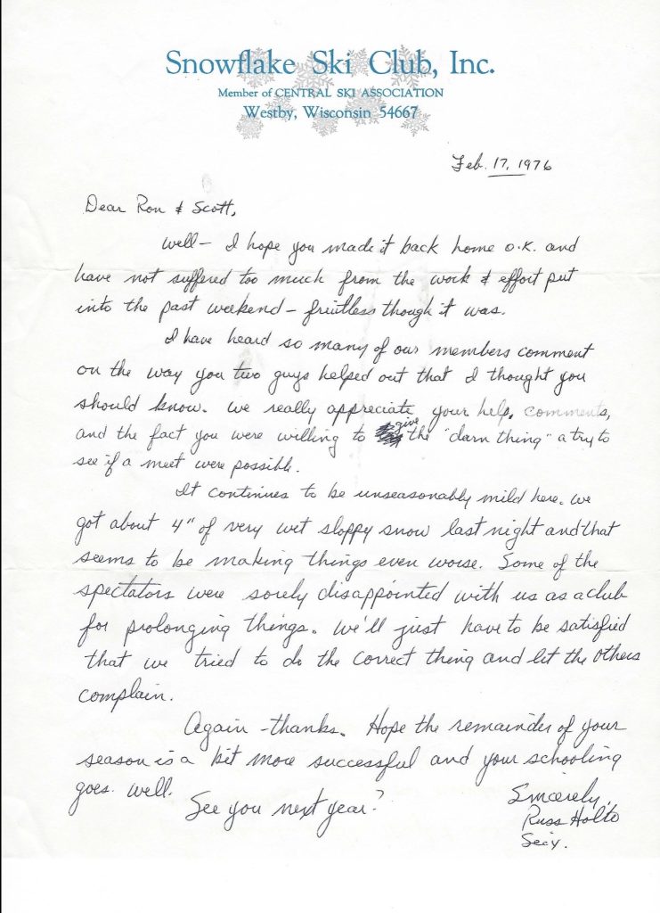 We’d just wrapped up the final U.S. Olympic Team Tryouts in Thunder Bay. The Innsbruck ‘76 team was set—Jim Denny, Jerry Martin, Terry Kern, Kip Sundgaard, Jim Maki, Chris McNeill and Greg Windsperger. Good men. Good teammates. And even better competitors. I’d been with many of them in Europe and through the whole tryout circuit. But I’d fallen just short—close enough to sting. That frustration rode south with me to Westby, WI, where the next domestic competition waited for all of us not headed to Innsbruck.