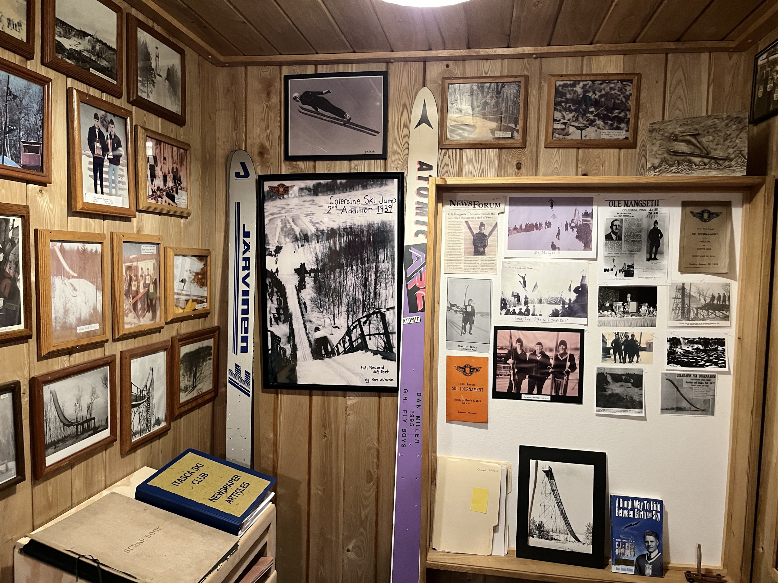 Articles and pictures of National Champions and Olympians produced by the Coleraine Ski Club, from the pioneer days to the present, can be found in the Museum. These include: Ole Mangseth, Barney Riley, Rolf Mangseth, Roy Laramie, Eugene Wilson, Bob Riley, and Jim Maki. The Museum also has a large display of all 20 Olympic ski jumpers and Nordic Combined athletes from Minnesota.