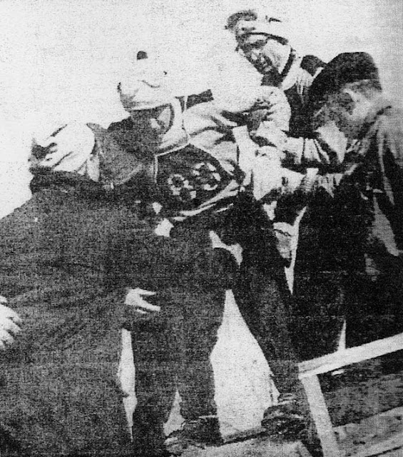 | Billy Olsen and Keith Zuehlke help George Carter off the Pine Mt. slide at 1958 US Nationals. |