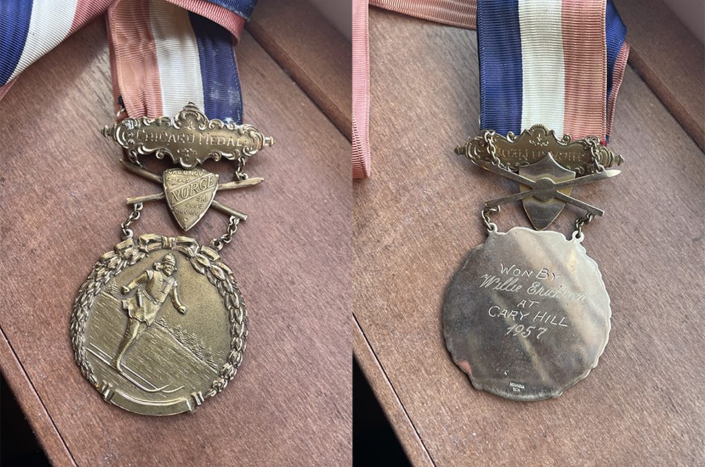 “The Norge Ski Club was perhaps the most premier club in the country,” he told me, turning the medal over in his hands. “They always brought in foreign skiers; the best in the world came to Chicago.” The Chicago Medal of Honor was awarded to the best jumper in that competition, and in 1957, that jumper was him. He laughs now when he talks about it, calling himself “just a young sh*t… 18 years old,” but that year meant everything. He won ten competitions, captured national titles, and solidified himself as one of the best ski jumpers in the country. He remembers staying at the Palmer House, standing in front of the president of the ski club as the medal was placed around his neck. He points to a photograph of that moment and then to the medal itself. “There are some things you never forget,” he says. Shoutout to Norge!