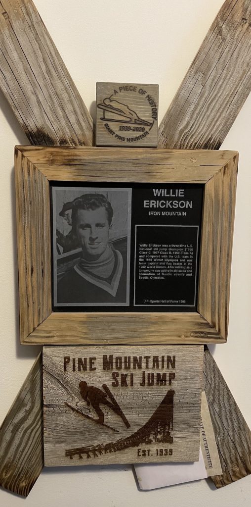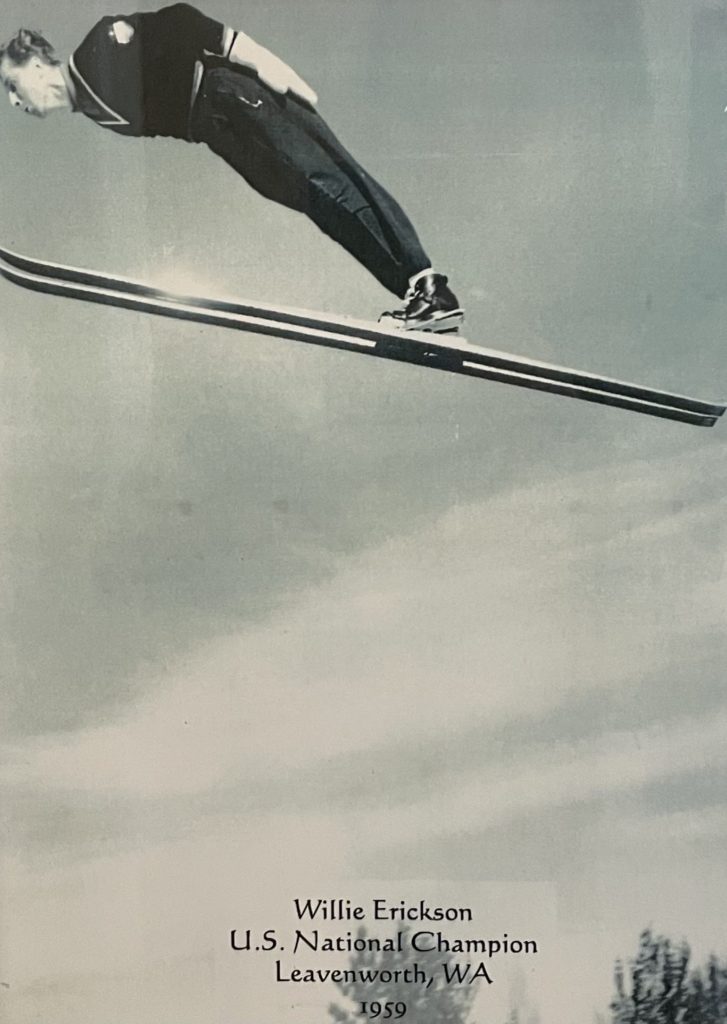 To the world, Willie Erickson is a business man and one of the most prominent American ski jumpers of the 1950s and 1960s. After his competitive career, he returned home and used his name and love for the sport to build a life in Iron Mountain – owning a restaurant, opening a ski sales and rental shop, and continuing to give back to the community that shaped him. Even decades later, he remains a local icon, a storyteller, and a keeper of ski jumping’s history, often appearing alongside other legends to share memories from what he calls the “poetry in the sky days.”
