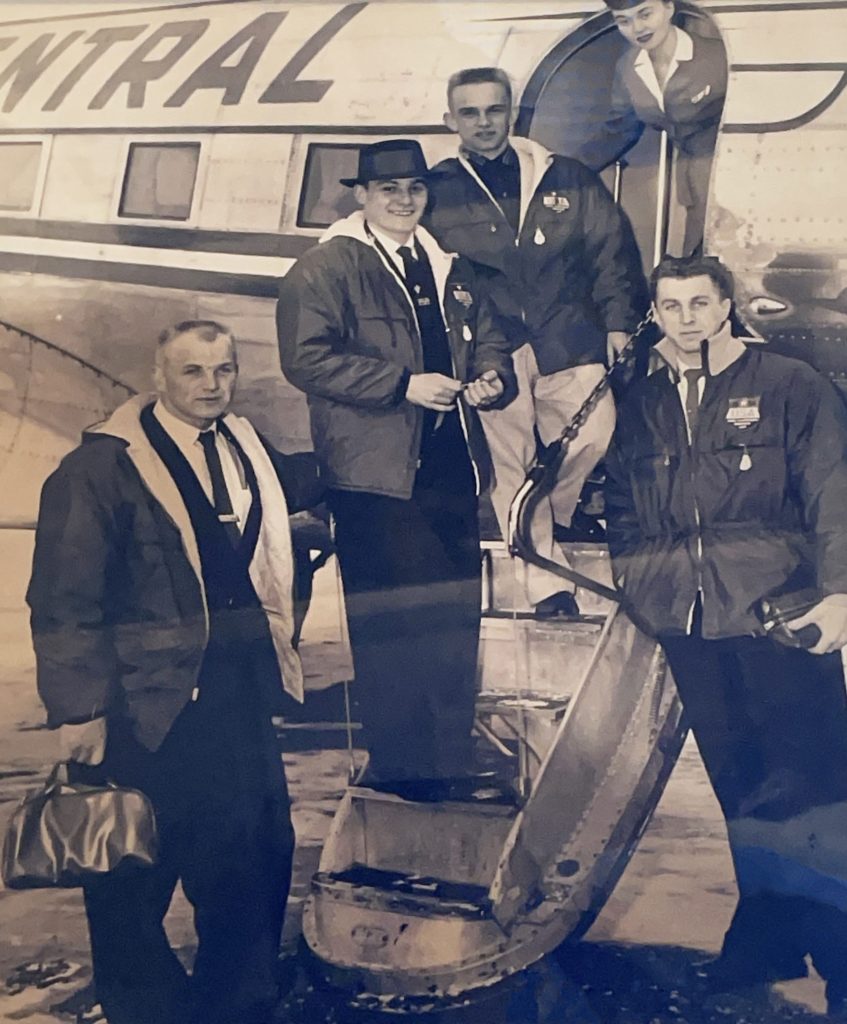 Today started with a FaceTime call with my mom while I was visiting my grandpa, and we were standing in front of his trophy case, one that looks like it holds enough awards for an entire team. As we moved slowly from shelf to shelf, he stopped at a photograph of four men posed outside of a small plane and said, “I was just showing Haley and telling her a little story about this picture right here… four guys from one ski club made the team. The four of us from Iron Mountain. Myself, Jim House, Dick Rahoi, and Rudy Maki. That was our first trip to Europe.” He laughed as he explained that back then, their jumping skis were so long they had to be laid down the middle aisle of the plane because they wouldn’t fit underneath with the luggage.