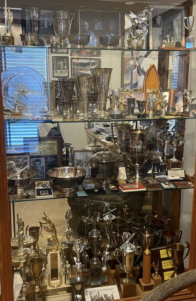 We moved on to a painting commissioned for him by Ted Tavonatti from the 1958 World Championships in Lahti, Finland – a moment frozen in time. That painting later hung in the bar he owned with my grandma, Willie’s Olympic Lounge, where stories like these lived on the walls as much as they did in conversation. He told me how, after retirement, he and Rudy Maki made it a tradition to return to Lahti for every World Championship. “Rudy and I were at the Seurahuone in 1978,” he said, “and we’re standing in the lobby when we see a big trophy case with a picture advertising the ’78 World Championships.” They went to the front desk and told the manager they had something to show him, that they had been there in 1958. The hotel staff took a photo of them standing proudly in front of the advertisement, delighted that two jumpers had come full circle. They repeated that pilgrimage every winter for as long as I can remember, until age finally made the journey too difficult.